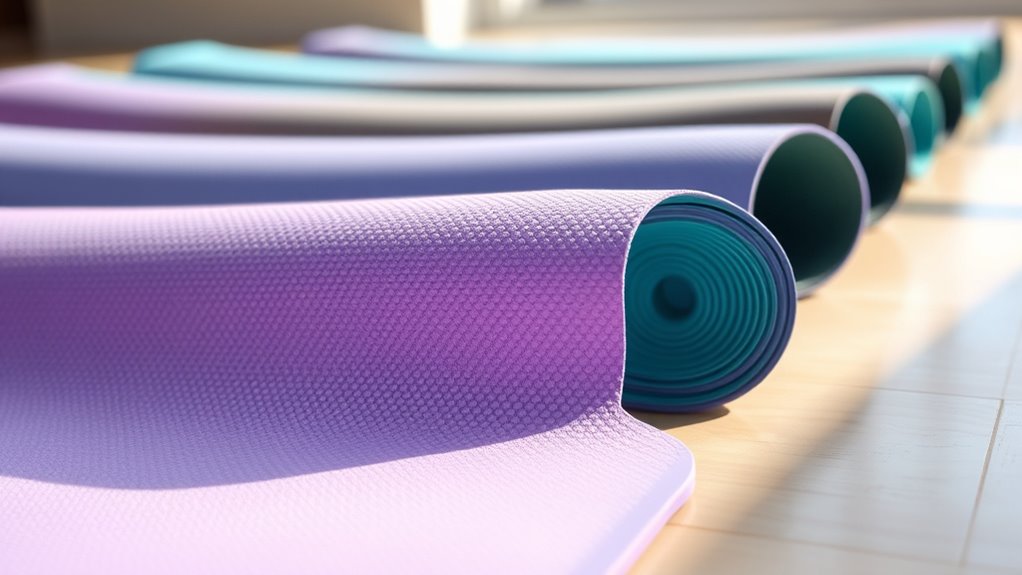 I believe textured surfaces truly impact both grip and joint comfort. A rougher texture often provides better traction, preventing slips during sweaty poses, while smoother textures can feel gentler on sensitive joints. I’ve found that medium-grit textures strike a perfect balance—offering stability without causing discomfort. When choosing a mat, I always consider how the texture supports my grip and how it feels against my joints, ensuring a safer, more comfortable practice.