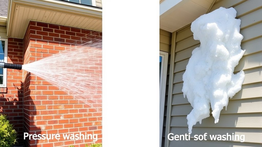 When choosing between pressure washing and soft washing for your home, I consider your surfaces and what needs cleaning. Pressure washing is best for tough, durable surfaces like concrete or brick, while soft washing works well for delicate materials like siding, shingles, or stucco. If you want to avoid damage and target biological growth, soft washing often is the safer choice. Stick with me, and you’ll discover which method suits your home best.