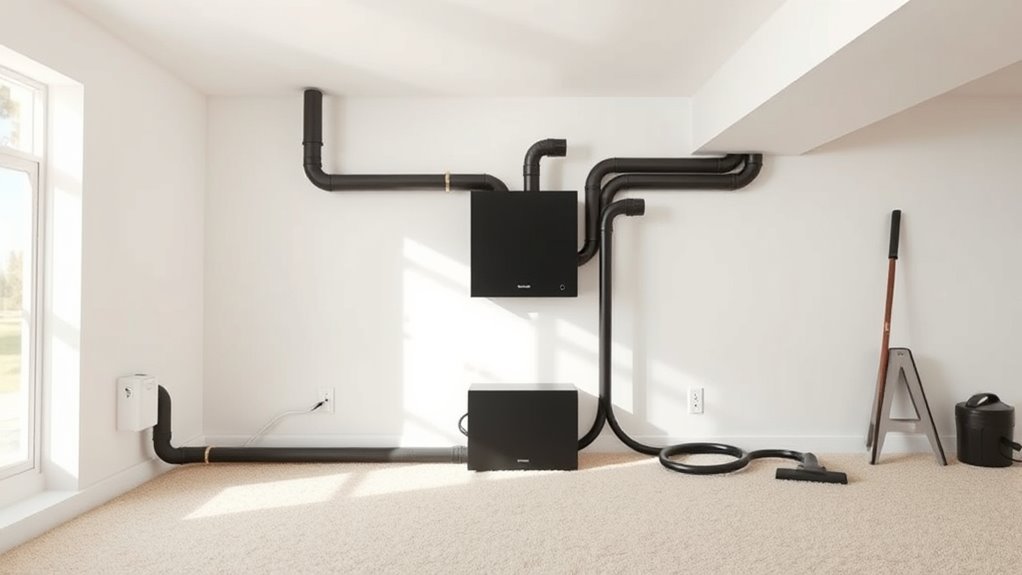 Maintaining your central vacuum system is essential for ensuring it runs quietly and efficiently over time. Regularly cleaning or replacing filters keeps suction strong and noise levels low. Check disposable bags or washable filters every few months—depending on usage—to prevent clogging and maintain quiet operation. Properly sealing and inspecting piping and connections helps avoid air leaks that can increase noise and reduce suction. Periodic removal of debris from motor and filter compartments minimizes internal noise caused by dust buildup or obstructions. Following the manufacturer’s maintenance guidelines and using recommended parts and accessories not only keeps your system running smoothly but also extends its lifespan. Consistent upkeep guarantees your central vacuum remains silent and effective, providing long-term comfort without waking the neighbors.