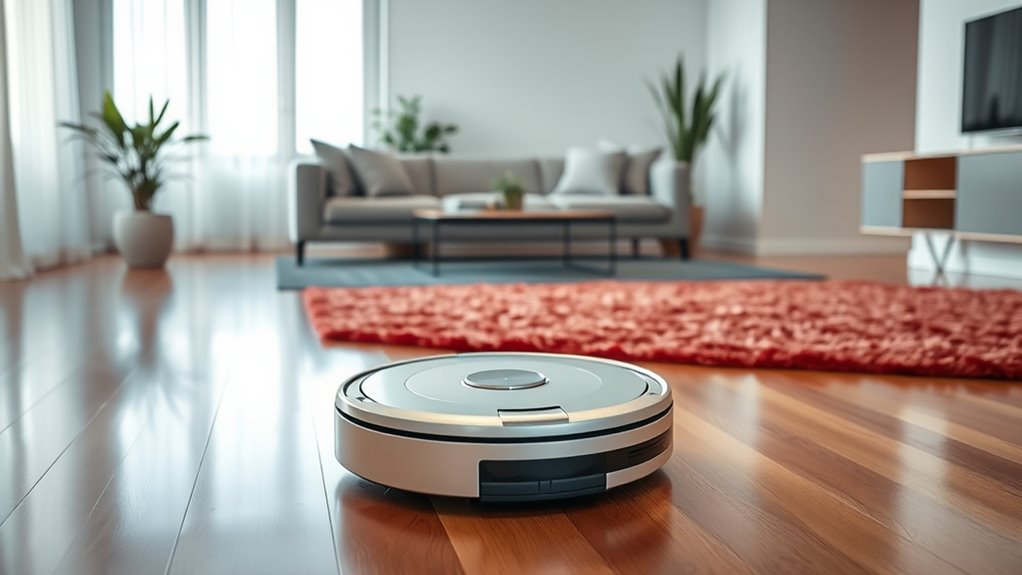 To maintain my robot vacuum for peak performance, I regularly clean the brush rolls and empty the dustbin after each use. I also check the filter monthly and replace it when it’s worn out. Keeping the sensors free of debris helps guarantee accurate navigation. Every few months, I inspect the wheels and remove any tangled hair. By following these simple steps, I keep my vacuum running smoothly and efficiently.