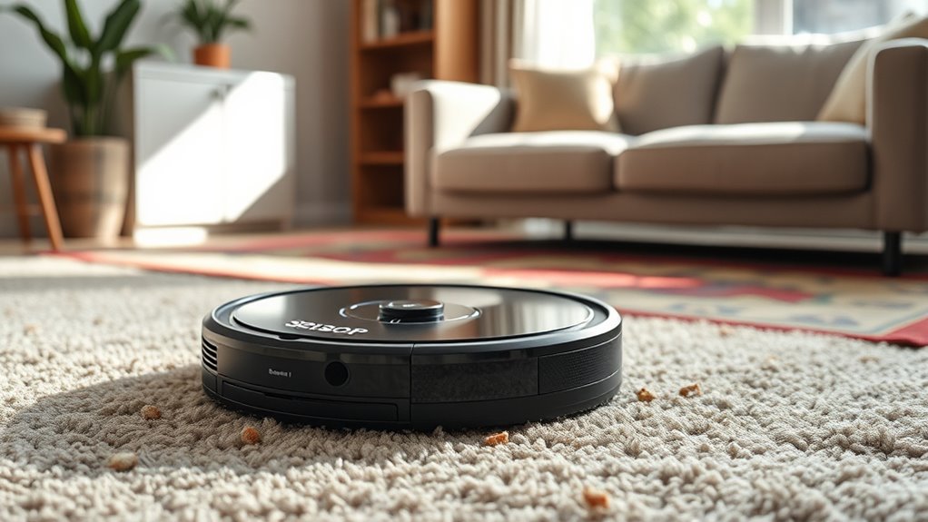 A robot vacuum’s battery life plays a crucial role in guaranteeing it can thoroughly clean carpets without frequent interruptions. Longer battery life means it can cover larger areas or multiple rooms in one session, reducing the need for recharging. I recommend a runtime of at least 90 minutes for effective cleaning on standard-sized carpets. Shorter durations often mean the vacuum has to stop, recharge, and then resume cleaning, which can extend the overall process. High-capacity batteries with quick recharge features are especially beneficial, allowing for more efficient cleaning sessions, particularly in bigger homes or during deep cleans. Ultimately, choosing a model with ample battery life ensures your carpets get a thorough, uninterrupted cleaning, saving you time and effort.