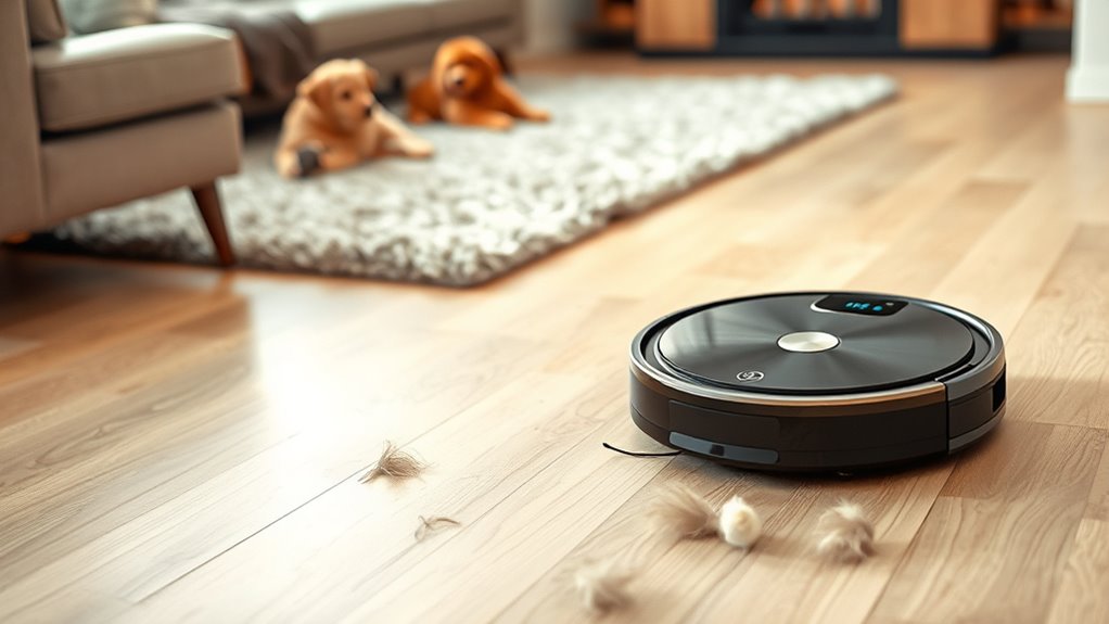 Robot vacuums handle multiple pet hair types quite well, especially models with strong suction and specialized brushes. I’ve found that those with multi-surface brushes and powerful motors easily pick up both fine fur and coarser hair from different pets. Regular maintenance, like cleaning brushes and filters, helps them perform consistently. Overall, I recommend choosing a model designed for pet hair to guarantee it manages multiple hair types efficiently and keeps your home spotless.