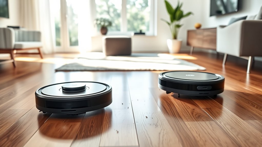 When comparing the Roomba i3 and i7 models in 2025, I find that the i7 offers stronger suction, advanced mapping, and smarter navigation, making it better for larger or complex homes. The i3 is more budget-friendly with decent cleaning but less sophisticated features. If you want top performance and smart controls, the i7 is the way to go. Keep exploring to find out which model best fits your needs and budget.