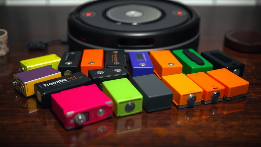 Choosing the right capacity for your Roomba’s replacement battery is essential if you want to maximize its runtime and cleaning efficiency. A higher capacity, measured in milliamp-hours (mAh), generally means your Roomba can run longer before needing a recharge. If you opt for batteries with increased voltage, like 14.4V, they can deliver more power, enhancing cleaning performance. Remember, doubling the mAh can roughly double your Roomba’s operational time, given consistent power consumption. Also, consider the battery’s cycle life; those with around 1000 charge cycles usually offer longer-lasting performance. In conclusion, balance capacity with size and compatibility to ensure your new battery fits properly and maintains safety and function without sacrificing runtime.
