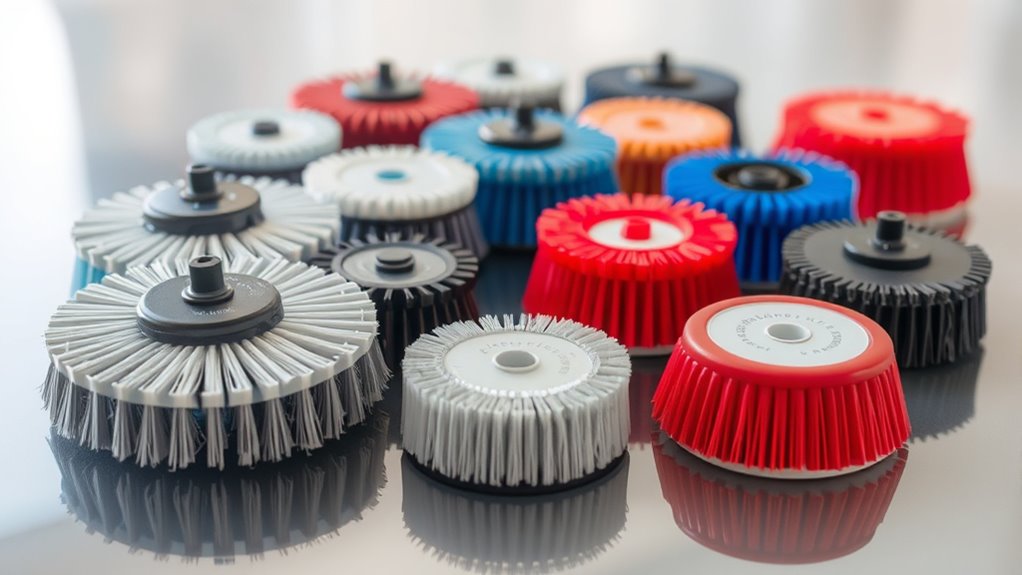 The quality of bristle materials plays a vital role in how well your Roomba side brush performs over time. High-quality materials like durable nylon or ABS help the brush keep its shape and cleaning effectiveness, even after many uses. Soft yet sturdy bristles are ideal—they reach into corners and along walls without scratching floors or carpets. Wear resistance is essential, especially if you have pets or high foot traffic, as it guarantees consistent debris pickup. The density and length of the bristles also matter; they determine how effectively the brush sweeps dust, hair, and larger debris. Good material quality means the brush can withstand bending, curling, and frequent replacements, ultimately extending its lifespan and maintaining ideal cleaning performance.