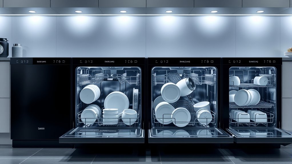Have you ever considered how different washing programs can streamline your dishwashing experience? Samsung dishwashers offer a range of options like Normal, Heavy, Delicate, Eco, and Quick cycles, making it easy to match the cycle to your load. Some models include specialized settings such as Sanitize, Rinse, and PowerWash, which boost sanitation and stain removal. The number of programs varies from 6 to 15, giving you flexibility for different soils and load types. Advanced features like Smart Wash or AutoSense automatically adjust settings based on the load’s dirtiness and size, optimizing water and energy use. These diverse options ensure you get thorough cleaning while conserving resources, making your dishwasher more efficient and tailored to your needs.