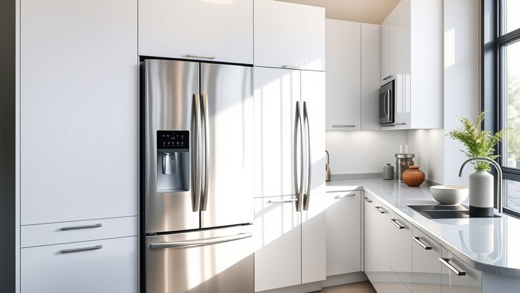 When selecting a side-by-side refrigerator, it’s important to contemplate door configuration flexibility, as it can greatly impact how well the appliance fits into your kitchen. I recommend checking if the door hinges are reversible, allowing you to switch the door swing to suit your space. Make sure the model supports both right-hand and left-hand opening options to maximize convenience. Additionally, look for adjustable or removable door shelves, which help customize the layout based on your needs or changing kitchen setups. Compatibility of door hinges and handles with your preferred swing direction is also key, ensuring smooth operation. Finally, opt for models that offer customizable door configurations, making it easier to adapt your refrigerator to evolving kitchen designs.