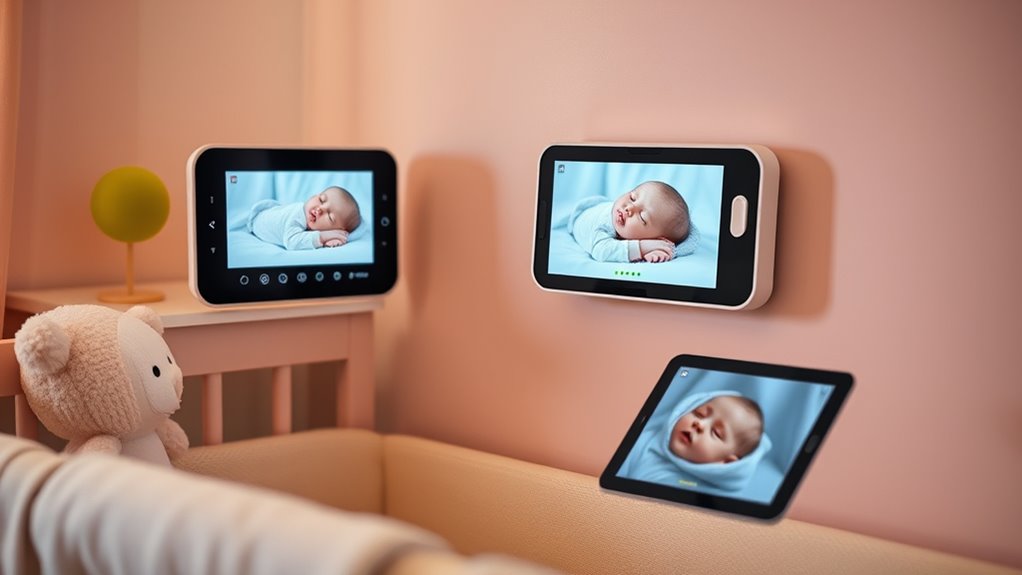 I understand your concern about data security. Most top-rated baby monitors use encryption to safeguard your data during transmission, making it very difficult for hackers to access. Manufacturers are continuously updating their security measures to stay ahead of threats. Still, I recommend choosing monitors with strong encryption, regular firmware updates, and reputable brands to guarantee your child’s privacy stays protected. Trustworthy devices prioritize your family’s security.