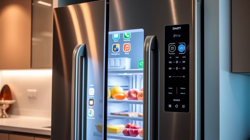 Smart connectivity options play a pivotal role in getting the most out of a refrigerator’s touch screen. With Wi-Fi and Bluetooth, I can control and monitor my fridge remotely through dedicated mobile apps, making management easy. Compatibility with voice assistants like Amazon Alexa and Google Assistant allows me to use voice commands for tasks like adjusting temperatures or checking the status. Many models offer apps that send alerts, diagnostics, and usage insights, helping me stay on top of maintenance and efficiency. Seamless integration with my smart home ecosystem means I can automate functions like scheduling defrost cycles or controlling lighting. However, reliable connectivity depends on a stable internet connection and compatibility with existing smart devices, ensuring my fridge functions smoothly and integrates effortlessly into my daily routine.