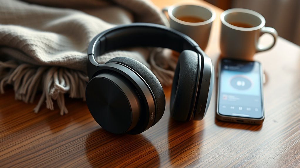 Finding the right fit is essential for enjoying the Sony WH-1000XM6, especially during long listening sessions. I recommend looking for headphones with adjustable headbands and padding to guarantee comfort over extended periods. The over-ear design with memory foam cushions offers excellent pressure distribution, making it easier to wear them for hours. Lightweight options, ideally under 10 ounces, help prevent fatigue. Ergonomic features like seamless swivels and stepless sliders allow for a customized fit, so you can find what works best for you. Ultimately, pay attention to the materials used; synthetic leather or breathable fabrics can enhance comfort and minimize skin irritation, making your listening experience even more enjoyable.