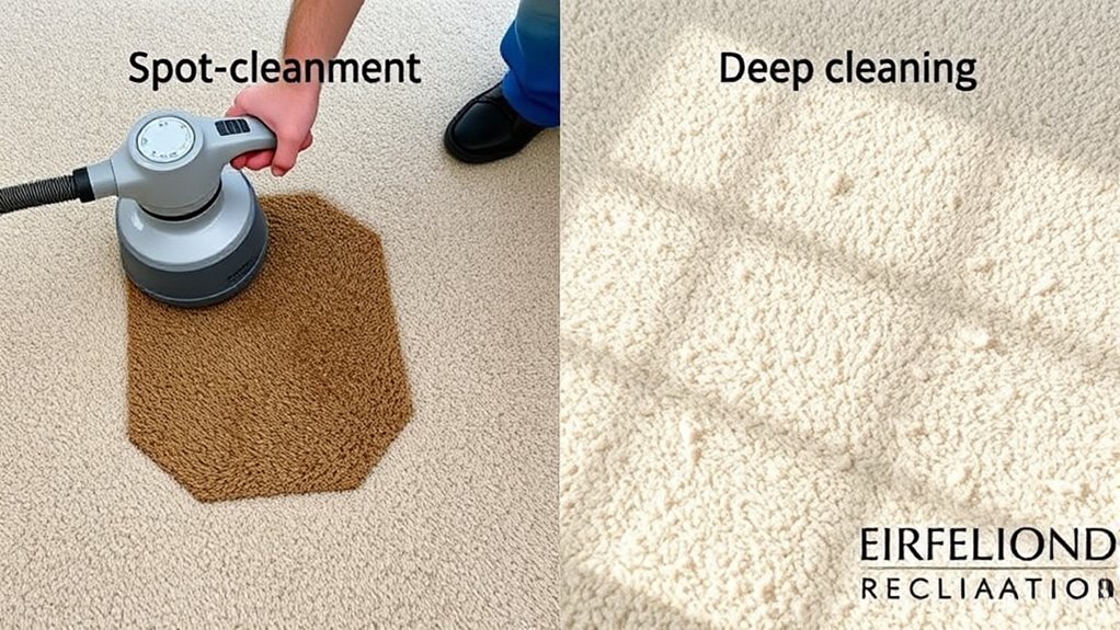 Choosing between spot cleaning and deep cleaning depends on your stain’s severity and the area’s condition. Spot cleaning is quick and ideal for recent spills or high-traffic spots, while deep cleaning tackles embedded dirt and odors in entire carpets or upholstery. If you’re dealing with stubborn stains or frequent messes, deep cleaning is a smart choice. Keep exploring to find out which method suits your needs best and how to get professional results.