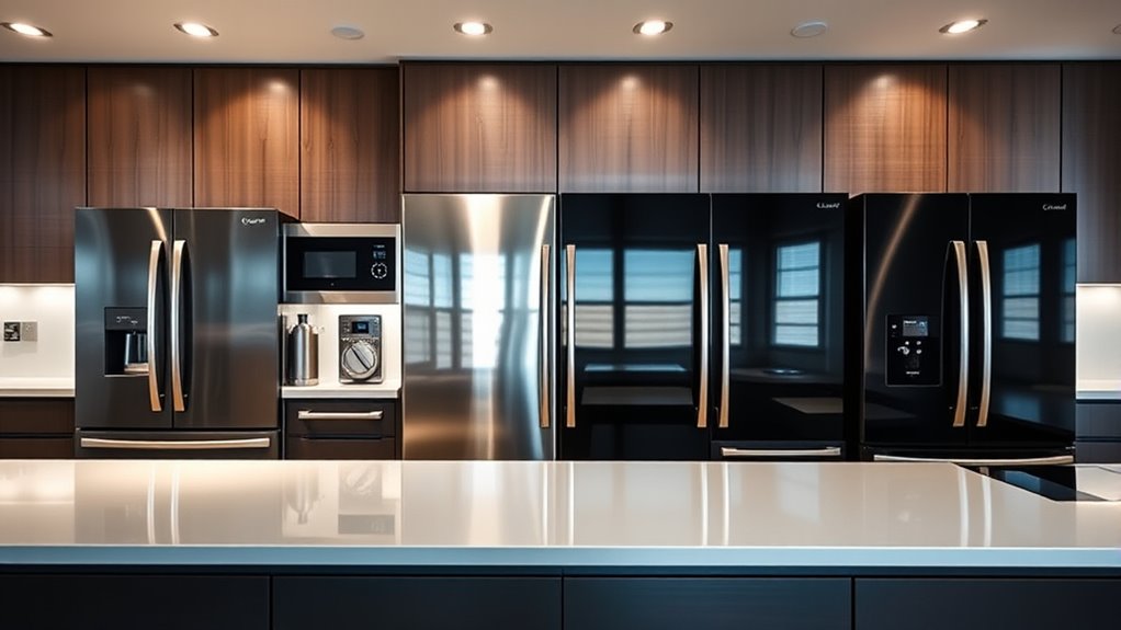 In 2025, I find black stainless steel appliances popular for their sleek, modern look and smudge resistance, making them low-maintenance. Classic stainless steel remains a versatile, durable choice, especially for traditional or timeless decor. Black stainless can show scratches more easily but offers a contemporary vibe, while stainless steel holds up better long-term. Curious about which style fits your kitchen best? Keep going, and you’ll discover the key factors to help you decide.