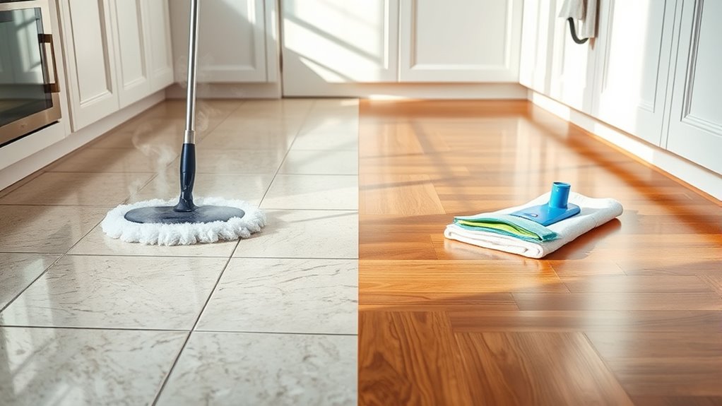 When considering how clean and safe a cleaning method is, chemical-free sanitization plays a vital role. Steam mops sanitize floors using high-temperature steam that kills 99.9% of bacteria without chemicals, making them a safe choice for families with kids and pets. In contrast, Swiffer mops often rely on pre-moistened cloths with cleaning solutions, which may contain chemicals unless labeled as chemical-free. Some Swiffer products use water-based or fragrance-free solutions, but many include detergents and fragrances that could pose health concerns. The effectiveness of steam mops depends on heat and contact time, providing deep, chemical-free cleanliness. Overall, steam mops offer a more consistent chemical-free sanitization method, while Swiffer’s eco-friendliness depends on the specific cleaning cloths used.