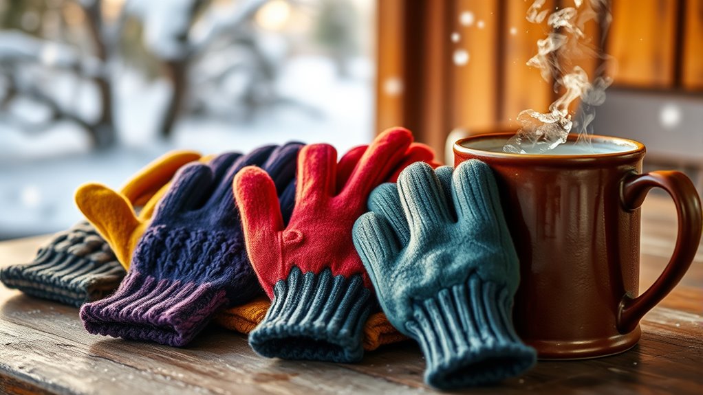 While it’s essential to have touchscreen gloves that work seamlessly with my devices, I’ve learned that weather resistance features can make all the difference in comfort and usability. I always look for gloves made from water-resistant or waterproof materials like treated polyester or TPU to keep my hands dry in rain or snow. Windproof fabrics also play a vital role, blocking cold air and enhancing warmth. Sealed seams are a must to prevent water seepage, especially during prolonged exposure to wet conditions. Additionally, gloves with water-repellent coatings help moisture bead off, keeping them drier longer. I also prefer adjustable cuffs that fit snugly around my wrists, preventing wind and water from sneaking in while I stay connected.