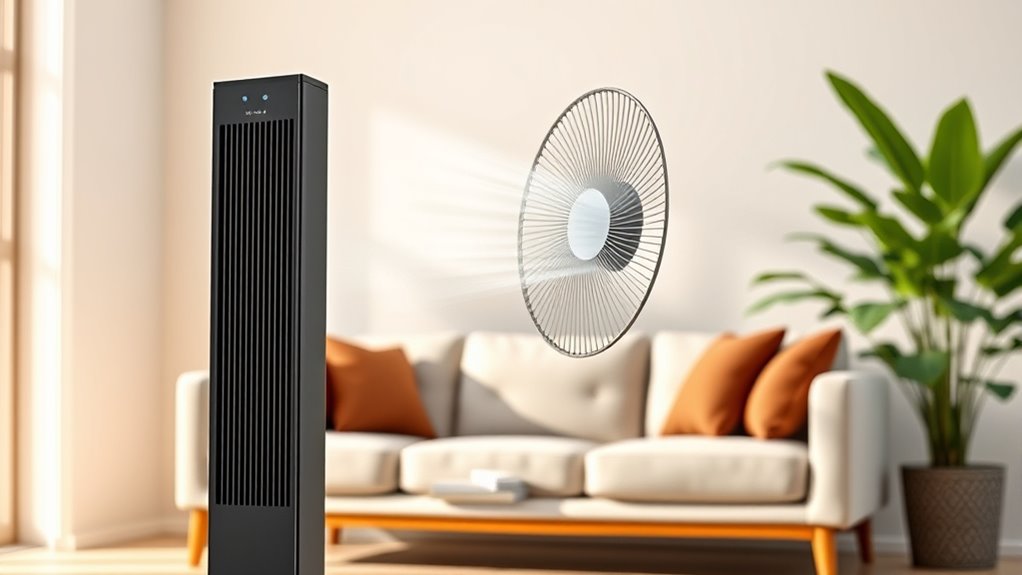 I’ve found that many tower fans do improve indoor air quality, especially those equipped with HEPA filters or ionizers. They can remove dust, pollen, and other allergens, making the air healthier to breathe. Plus, some models include humidifiers, helping balance humidity levels. While they primarily cool, these features mean tower fans can also contribute to cleaner, fresher indoor air, making your space more comfortable overall.