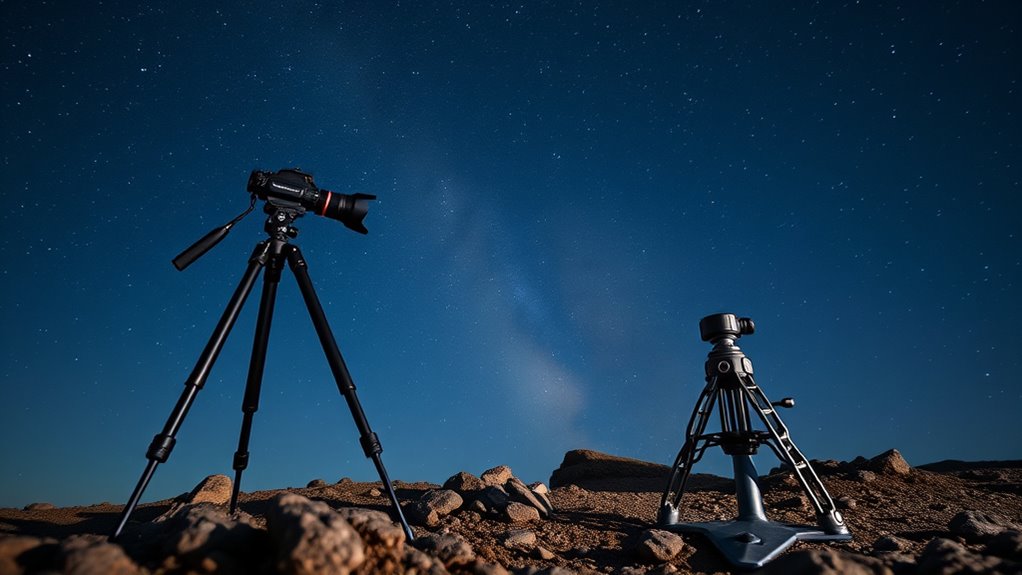 Achieving sharp astrophotography images hinges on selecting a tripod or pier mount that offers excellent stability and vibration control. Using durable materials like stainless steel or aluminum helps absorb and dissipate movement during long exposures, minimizing vibrations. Incorporating vibration dampening pads, adjustable tension mechanisms, or counterweights can further stabilize the setup. The design of the mount also plays a vital role—having a low center of gravity and a broad base reduces wobble and enhances overall stability. Locking mechanisms on the legs and head prevent unintended movement, keeping your gear steady throughout your session. Additionally, ensuring the weight capacity exceeds your total payload prevents flexure, maintaining consistent, vibration-free tracking for clear, crisp astrophotos.