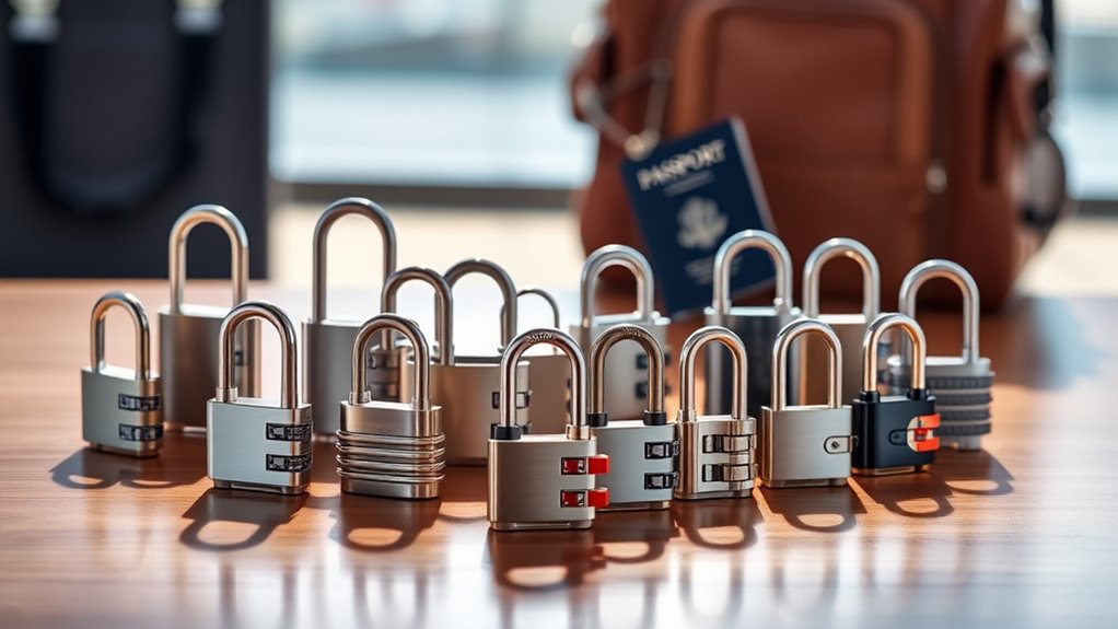 Along with the combination options, TSA compatibility is a key factor to contemplate when selecting luggage locks. TSA-compatible locks use a universal master key, allowing agents to inspect your luggage without damaging it. This feature is vital when traveling, as it’s accepted at over 750 airports worldwide, aligning with international security standards. Most of these locks employ a standardized mechanism that guarantees hassle-free inspections, reducing the risk of damage from forced entry. Plus, the inspection indicator alerts you if your bag has been accessed, giving you peace of mind. When I choose TSA-approved locks, I know I’m making certain a smoother travel experience while safeguarding my belongings against loss or damage.