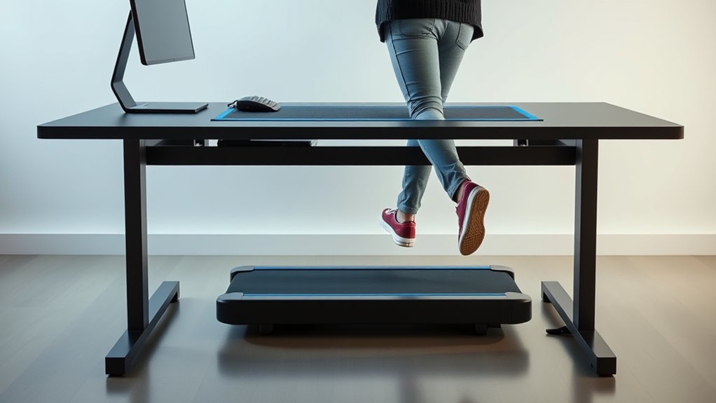 Choosing an under-desk treadmill that fits well with your standing desk begins with evaluating its dimensions and compatibility with your workspace. Make sure the treadmill’s width and length align with your desk’s footprint to avoid overcrowding or instability. Check the maximum weight capacity to ensure it supports your body weight and any accessories you plan to use. Also, confirm that the treadmill’s height adjustment range matches your desk height for ergonomic comfort whether sitting or standing. Consider whether the design is foldable or compact enough to fit under your existing furniture easily. Ultimately, review the control interface—whether it’s a remote, app, or LED display—to ensure it’s compatible with your preferred operation method. Proper fit and compatibility are essential for a seamless, comfortable experience.