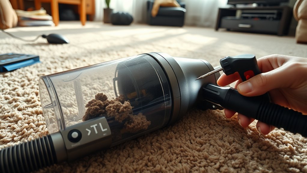 If your vacuum still won’t turn on after checking the cord and plug, internal wiring issues might be the cause. Loose or damaged wires within the power switch or motor circuit can prevent electricity from reaching the motor, leaving it unresponsive. Broken solder joints or disconnected connectors often lead to incomplete circuits, stopping power flow entirely. Additionally, worn insulation or frayed wiring can cause short circuits, which may trip the vacuum’s safety features and shut it down. Diagnosing these wiring faults requires opening the vacuum’s casing carefully and using a multimeter to test for continuity. If you find broken or disconnected wires, repairing or replacing them can restore proper electrical flow. Always exercise caution, as working with internal wiring involves potential electrical hazards.