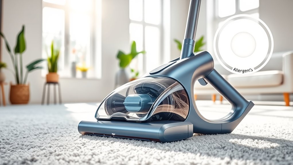 The key to effectively reducing allergens in your home lies in a vacuum’s ability to capture and contain tiny particles. HEPA filters are essential because they trap at least 99.97% of airborne particles as small as 0.3 microns, greatly reducing allergens like dust, pollen, and pet dander. Vacuums with sealed systems prevent these particles from escaping back into the air during and after cleaning, ensuring all allergens stay contained. Anti-Allergen Complete Seal Technology further enhances this by locking in allergens rather than releasing them. Additionally, washable filters that can be rinsed and dried help maintain filtration efficiency over time, reducing the risk of allergen release. Prioritizing effective filtration and sealing is *vital* for improving indoor air quality for allergy and asthma sufferers.