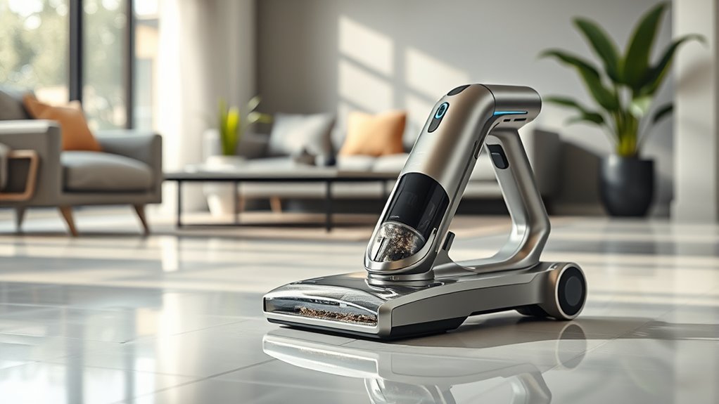 When selecting a vacuum cleaner, weight and maneuverability play a crucial role in making your cleaning routine easier and less tiring. Lighter models, typically under 8 pounds, are easier to carry and maneuver, reducing fatigue during extended cleaning sessions. Ergonomic designs and adjustable telescopic poles help you handle the vacuum comfortably and reach high or tricky spots with ease. Features like swivel steering and flexible hoses enhance maneuverability around furniture, corners, and tight spaces, making cleaning more efficient. Cordless vacuums offer greater freedom of movement compared to corded models, allowing you to clean without restrictions. Additionally, the overall size and shape of the vacuum influence how well it navigates different floor types and cluttered areas, ensuring a smoother, more effortless cleaning experience.