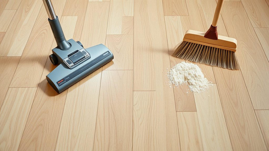 When choosing between vacuuming and sweeping, I find vacuums often better for deep cleaning, allergens, and delicate surfaces, thanks to powerful suction and filters. Sweeping is quicker and works well for large debris on hard floors, especially in tight spaces. Both methods have their pros, but understanding when and how to use each can make your floors spotless. Keep going, and you’ll discover which method suits your needs best.