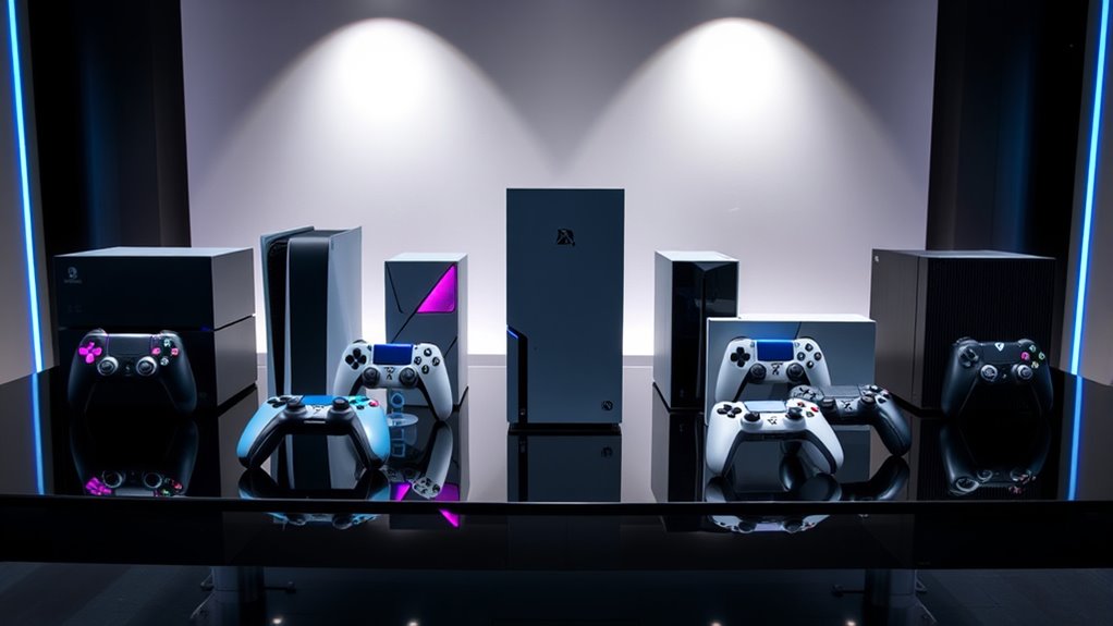 Choosing a console isn’t just about game compatibility; performance and graphics play a major role in delivering an immersive experience. High-performance consoles feature multi-core processors and advanced GPUs that ensure smooth gameplay at up to 120 FPS, making actions feel fluid and responsive. Support for 4K resolution and HDR technology enhances visuals with vivid colors and sharp details, creating a more lifelike experience. Next-generation consoles also use SSDs with large capacities and fast read speeds, drastically reducing load times and allowing seamless exploration of open worlds. Additionally, ray tracing capabilities simulate realistic lighting, shadows, and reflections, adding depth and realism to scenes. When evaluating consoles, consider these performance and graphics features for a truly immersive gaming experience that rivals real life.