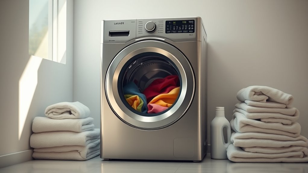 Ease of use is a essential factor when choosing a washing machine, as it determines how smoothly you can operate and manage your laundry routine. I look for machines with intuitive control panels, clearly labeled buttons, and simple settings that make selecting cycles straightforward. Digital displays, LED indicators, and preset programs help me monitor progress without hassle. Features like load sensing and automatic water level adjustments reduce manual effort, making the process more efficient. User-friendly designs, including accessible lid mechanisms and easy loading, save time and effort. Clear instructions and safety features such as child locks add peace of mind, ensuring a smooth, secure laundry experience. Ultimately, a machine that’s easy to use makes laundry less of a chore and more manageable.