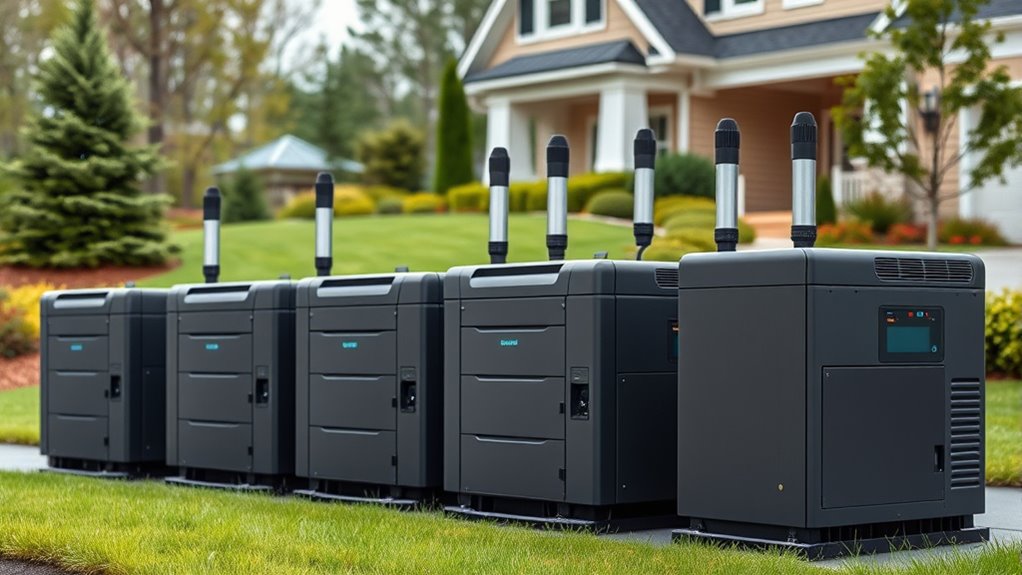 Choosing the right transfer switch is essential because it directly impacts how smoothly your whole house generator takes over during an outage. An automatic transfer switch activates instantly, ensuring seamless power transfer without manual effort. It should match your generator’s electrical load capacity—typically rated for 30A, 50A, or higher—so it can handle your home’s power needs safely. Advanced switches include safety features like load shedding, which prevents overloads, and diagnostic indicators that monitor system health. Some models offer remote monitoring, letting you check status and receive alerts via smartphone or control panels. Properly rated transfer switches are crucial for code compliance and safe operation, preventing back-feeding and electrical hazards during power transfer. Choosing a switch with these features ensures reliable, safe, and convenient power management.