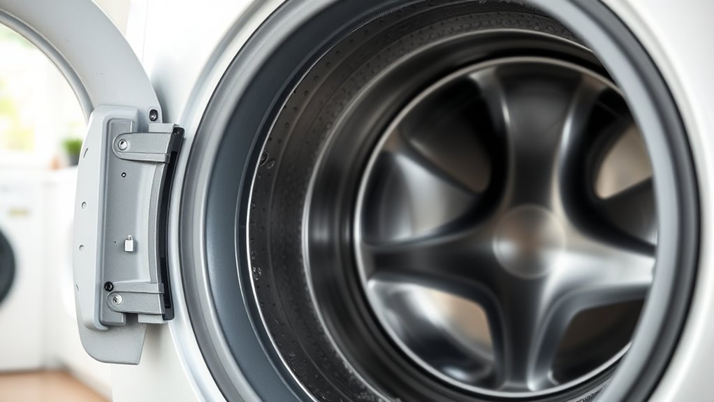 Have you ever wondered how proper ventilation and drying can prevent your washer from developing unpleasant odors? Ensuring good airflow is key. When moisture escapes, it stops mold and mildew from thriving inside the drum. I always leave the door open after cycles to let air circulate and residual moisture evaporate. Regularly running a maintenance cycle with hot water and cleaning agents helps remove buildup that causes odors. I also make sure not to overload loads, which improves airflow and speeds up drying. After each use, I thoroughly dry the interior and door seal to prevent lingering dampness. These steps create a drier environment inside the washer, *substantially* reducing the chances of musty smells developing over time. Proper ventilation and drying are simple but effective ways to keep your washer fresh.