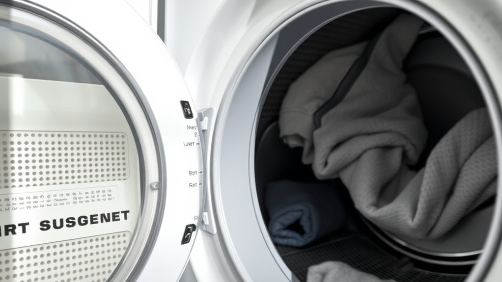 Properly loading your dryer is essential for effective drying because it guarantees hot air can circulate freely around your clothes. Overloading the drum blocks airflow, trapping moisture and leaving clothes damp. Conversely, underloading reduces heat circulation, causing longer drying times and uneven results. To optimize drying, follow your dryer’s load capacity guidelines, ensuring the drum isn’t too full or too empty. Distributing clothes evenly within the drum allows hot air to reach all items and promotes even drying. Proper load size also encourages tumbling, which improves heat transfer and moisture evaporation. Taking these steps helps maintain your dryer’s efficiency, prevents damage, and guarantees your clothes come out dry and fresh every time.