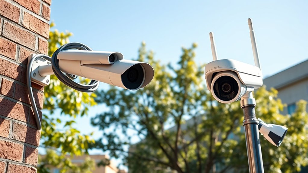 When choosing between wired and wireless security cameras in 2025, I look at my specific needs—wired cameras offer reliable 24/7 recording, high resolution, and durability for outdoor use, while wireless models are easier to install and flexible in placement, especially for smaller setups. Wired systems tend to be more stable, but wireless cameras are perfect for quick setups and remote access. If you want to discover which option best fits your situation, keep exploring the options available.