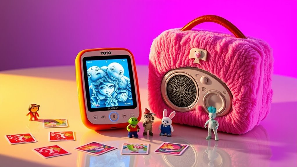 After considering battery life, it’s important to examine how price and value play into your decision between the Yoto Player and Toniebox. Both devices have varying prices based on models and bundles, which can markedly impact your overall value. The Yoto Player often comes with a higher price tag due to its extensive library of over 1,000 cards, offering a wealth of media choices. On the other hand, the Toniebox includes physical characters that add a collectible charm. Don’t forget to factor in the costs of additional content; Yoto’s digital cards might lead to ongoing expenses. Ultimately, comparing the initial purchase price against content volume and features will help you determine which device fits your family’s budget best.